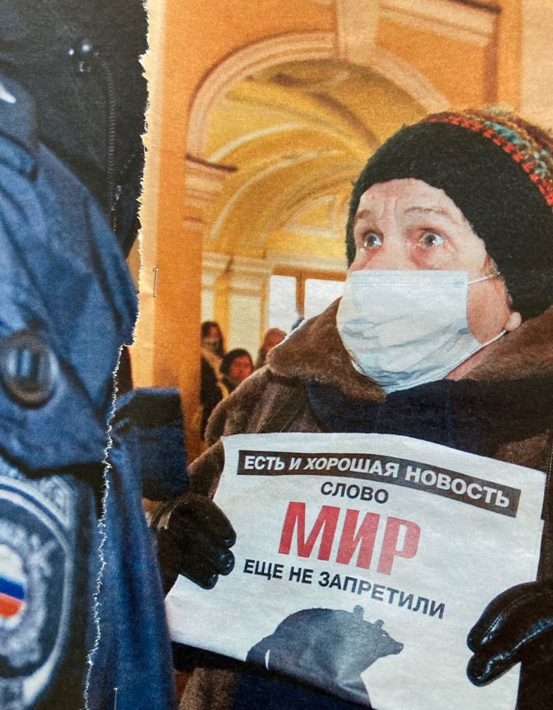 Auszug aus der Bildunterschrift dort: [Auf dem Schild dieser mutigen alten russischen Frau