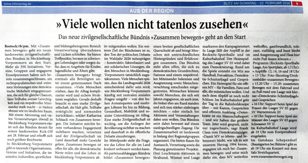 Zusammen bewegen steht für gegenseitige Unterstützung, Begegnung, Gerechtigkeit und Vielfalt. Wir sind ein Zusammenschluss aus hunderten engagierten Köpfen, Vereinen und Sozialverbänden aus Mecklenburg-Vorpommern.