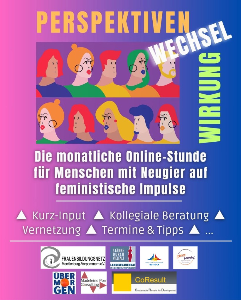 Kooperationspartner*innen: Frauenbildungsnetz MV & Landesfrauenrat MV & Büro für Gleichstellungsfragen Rostock & Ev.-Luth. Kirchenkreis Mecklenburg „Projekt Lebenswandel & Über.Morgen Gemeinschaft für Beratung, Bildung u. Zukunftsprozesse & Madeleine Porr Consulting & Danielle Cohn & CoResult